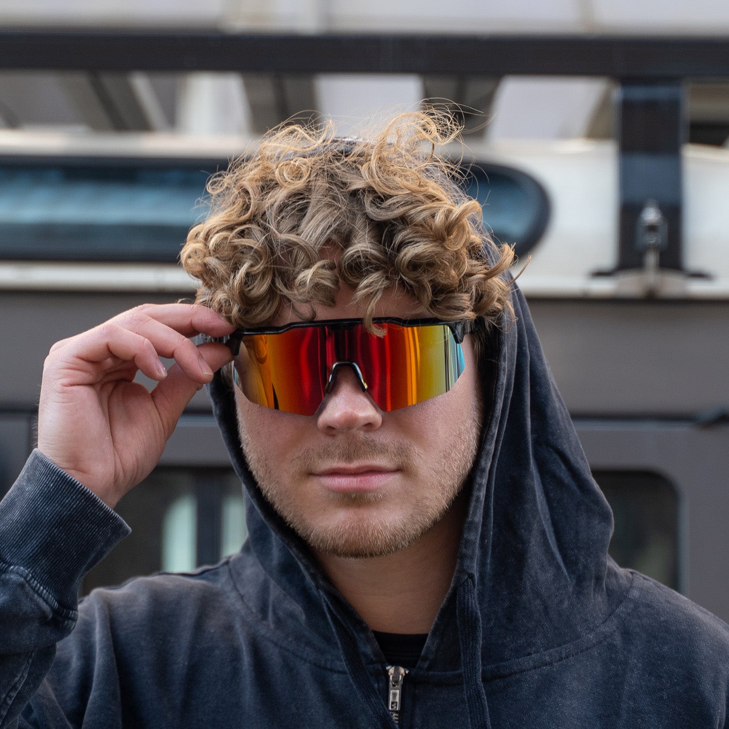 Valenzano Red er en cool sportsbrille med UV400 og røde/gyldne glas med spejleffekt. Brillestængerne er sorte med røde detaljer og et diskret “H” i den ene side. Perfekt til løbeturen, cykelturen eller en tur på padelbanen. Der medfølger et blødt brilleetui i grå, som også kan bruges som pudseklud.